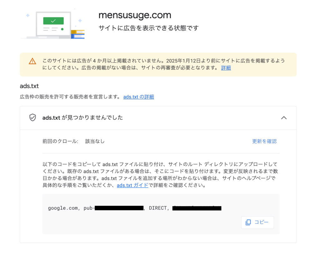 アップロード後、更新を確認を押すとads.txtが検出されましたと表示が出ればOKです。
